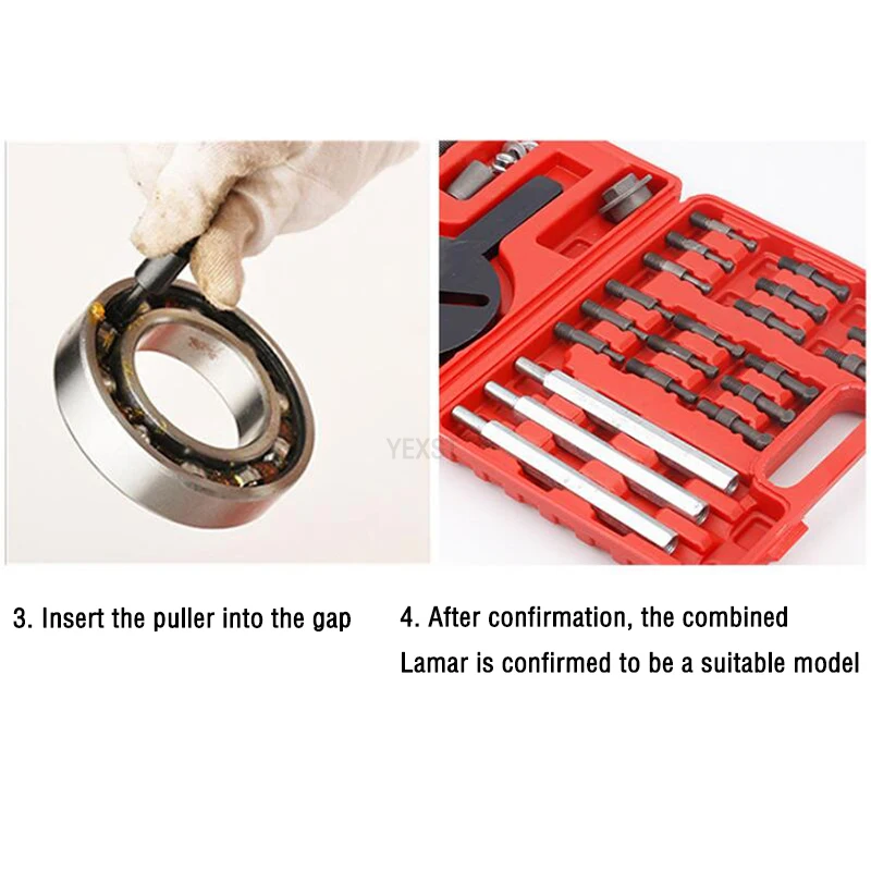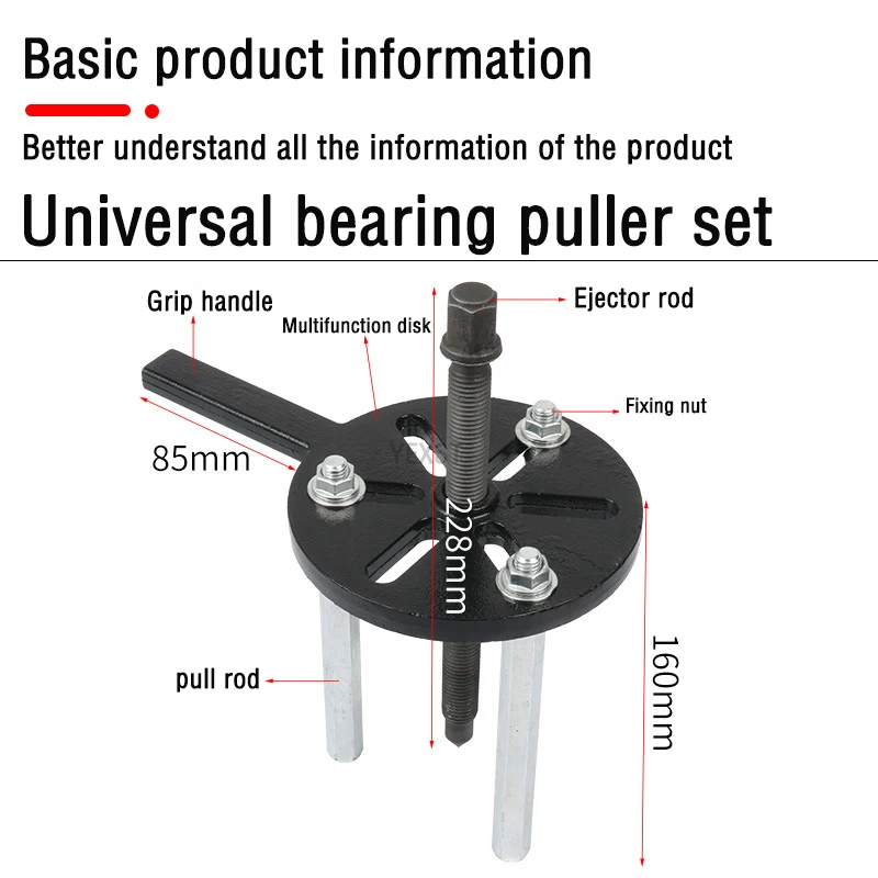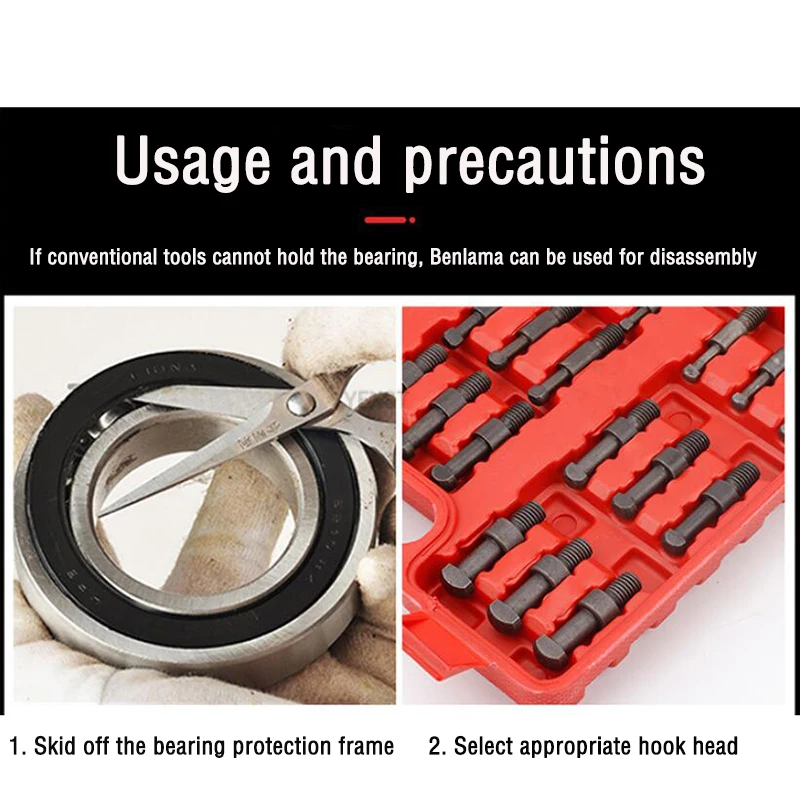 - Dụng cụ tháo vòng bi này có sáu kích cỡ khác nhau của Bộ kéo, có thể tháo nhiều loại vòng bi có hình dạng, kích cỡ khác nhau. Ba móc mới được thêm vào để giúp việc tháo gỡ dễ dàng hơn và có thể được áp dụng cho nhiều vòng bi có thông số kỹ thuật khác nhau.